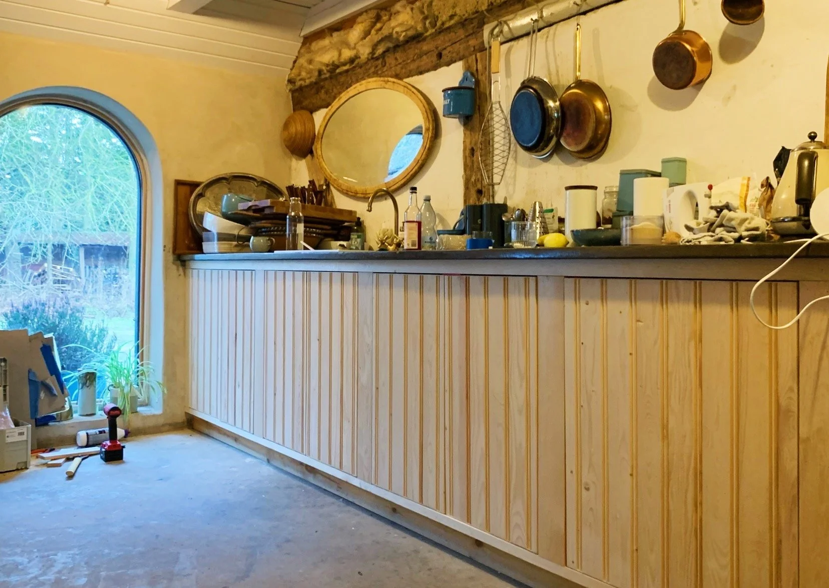 På en fin gammel gård skulle Liv og Lasses grovkøkken have nogle fine nye låger. Inspireret af bedste svenske landstil blev lågerne beklædt med i “perlestaf” beklædningsbrædder.